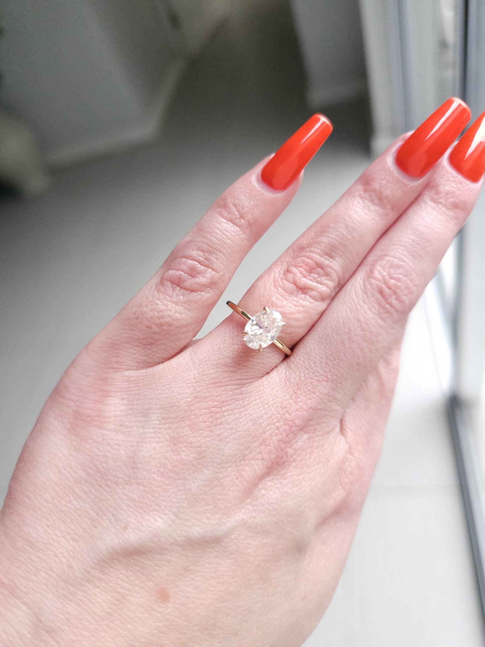 - Main Stone: 2.5ct Oval Brilliant cut Moissanite