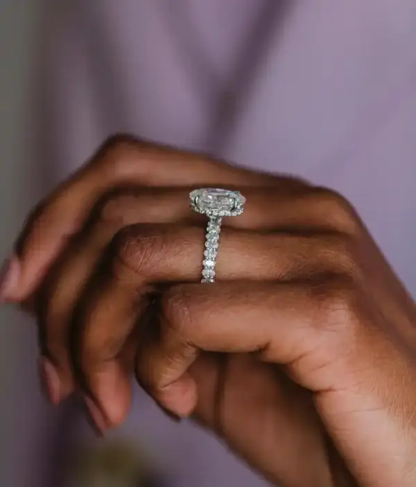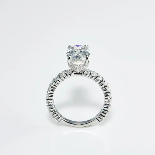 5.3ct Crushed ice Oval Moissanite with hidden halo and half eternity round Moissanite pavé Band